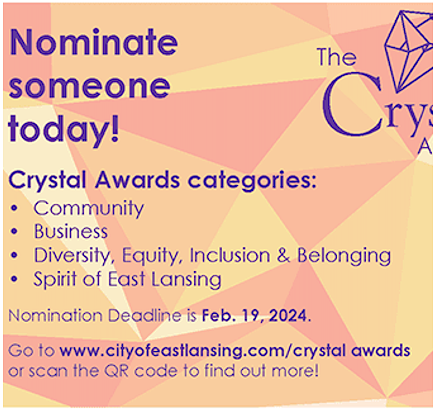 It’s the time of year again to nominate someone for the City of East Lansing’s Crystal Awards. The Crystal Awards program honors those who strive to make the City a more welcoming place to live, work and do business. The deadline to submit a nomination is Feb. 19. The four categories are: Community; Business; Diversity, Equity, Inclusion and Belonging; and Spirit of East Lansing. Previous winners have included coaches, representatives of neighborhood associations, volunteers and local businesses among many others. Here’s more information.