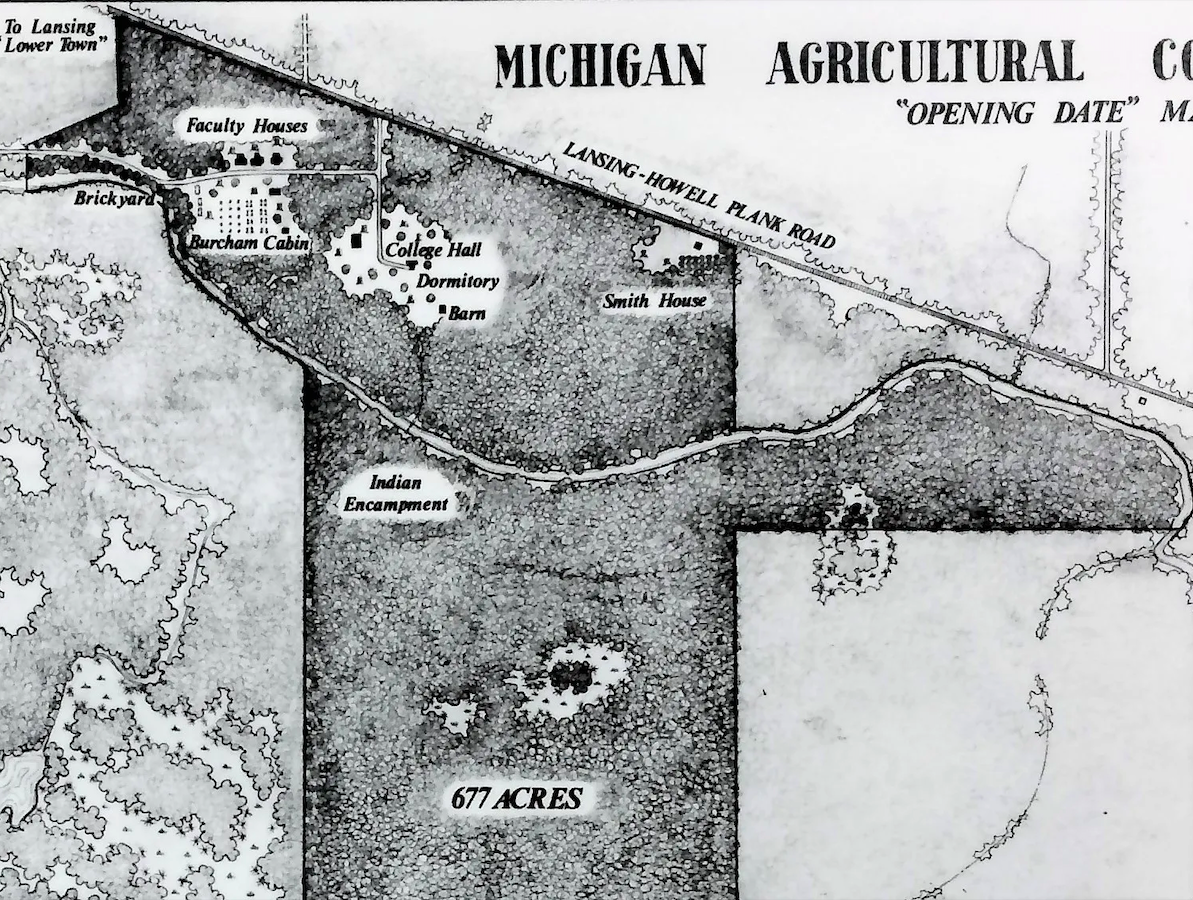 East Lansing’s mighty Burcham Drive derives its name from one of the city’s founding families. Robert Burcham purchased approximately 80 acres in 1849 in the area that is now East Lansing. Within two years, he had built a home in the spot that the MSU Music Building now sits. The 1975 book At the Campus Gate: A History of East Lansing tells readers that Burcham sold vegetables from his garden to the indigenous population that lived and fished on the Red Cedar River.