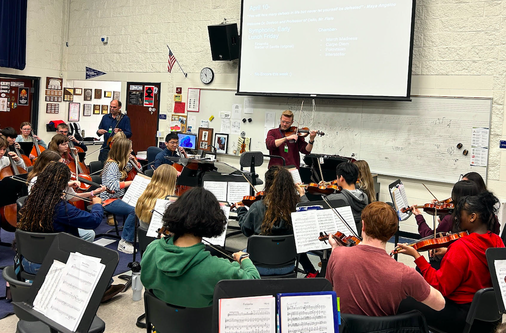 ELHS orchestra teams up with CMU, Okemos High School students for collaborative concert.