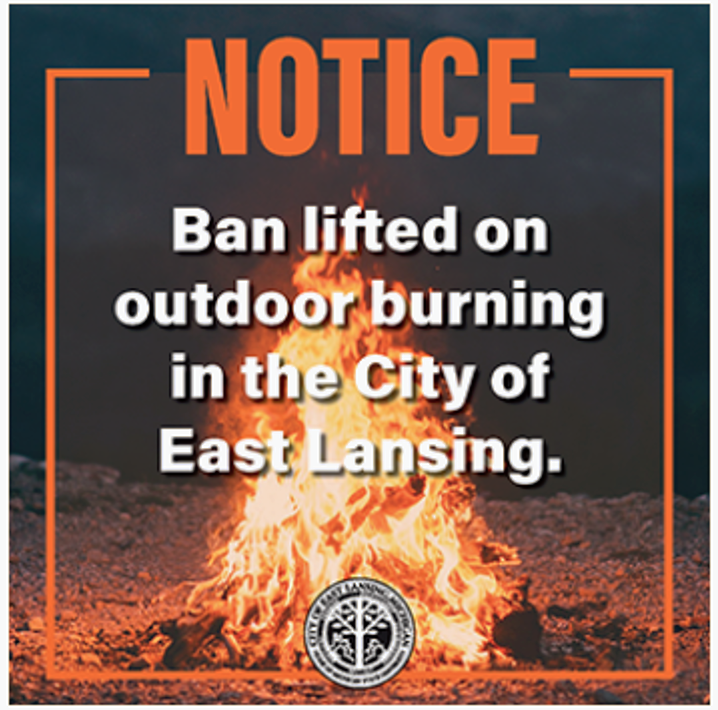 The City of East Lansing officially lifted the outdoor burning ban as of Wednesday (June 28) thanks to some wonderful, much-needed rain. Here’s the press release from the Fire Prevention Bureau of the East Lansing Fire Department (ELFD). Unfortunately, the air quality alert continues today (Saturday). Here’s the government link to find out our smokey numbers.