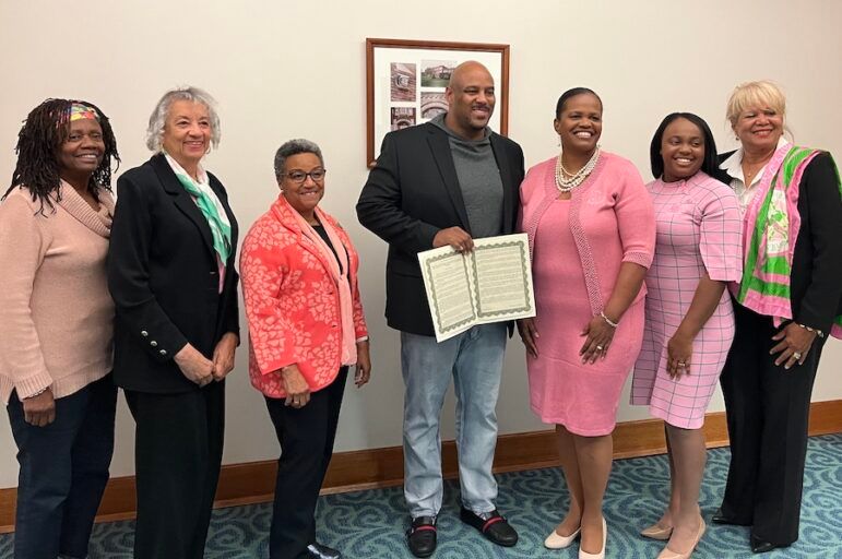 Recognition of the 20th anniversary of the Chi Epsilon Omega Chapter of the Alpha Kappa Alpha Sorority at City Council on Oct. 18, 2022, showing from left Cheryl Celestin, Janette Henderson, Patricia Quinn, Mayor Ron Bacon, President Lisa Jackson, Courtney Jackson and Barbara Tate. Alice Dreger for ELi