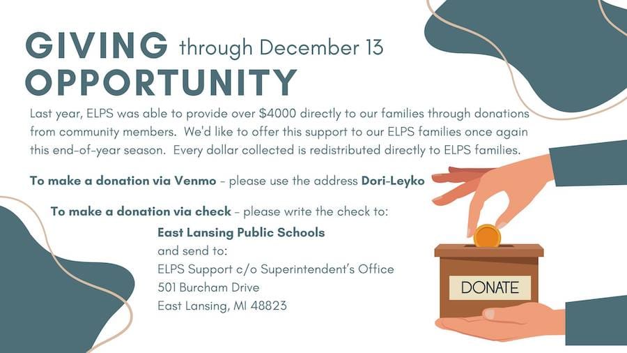 Mara reported on the Monday (Nov. 27) East Lansing Board of Education meeting. At that meeting, school officials promoted a program that collects donations to help ELPS families in need. The principal and a teacher also shared about a mural at Whitehills Elementary School created by students as part of social justice focused activities.
