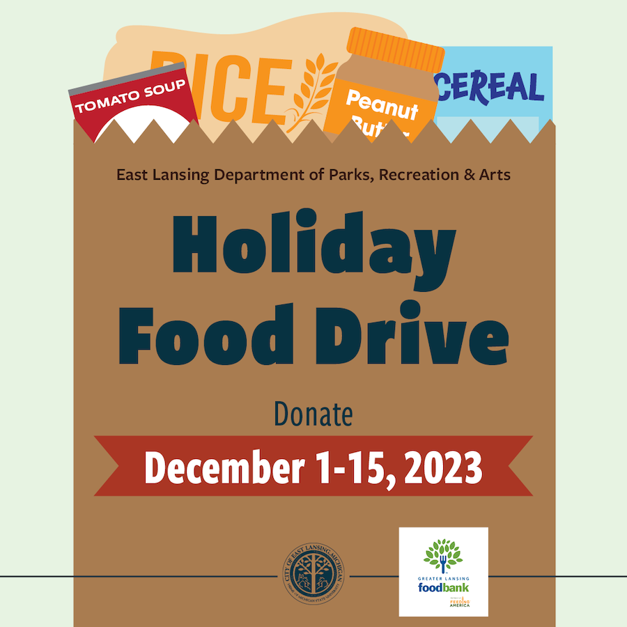 The East Lansing Department of Parks, Recreation and Arts (ELPRA) is hosting a holiday food drive to benefit the Greater Lansing Food Bank this season. The goal for this year’s holiday food drive is to collect 1,500 pounds of food. Donations should be dropped off inside the East Lansing Hannah Community Center (ELHCC), 819 Abbot Road, through Dec. 15. Here’s more information from the city.