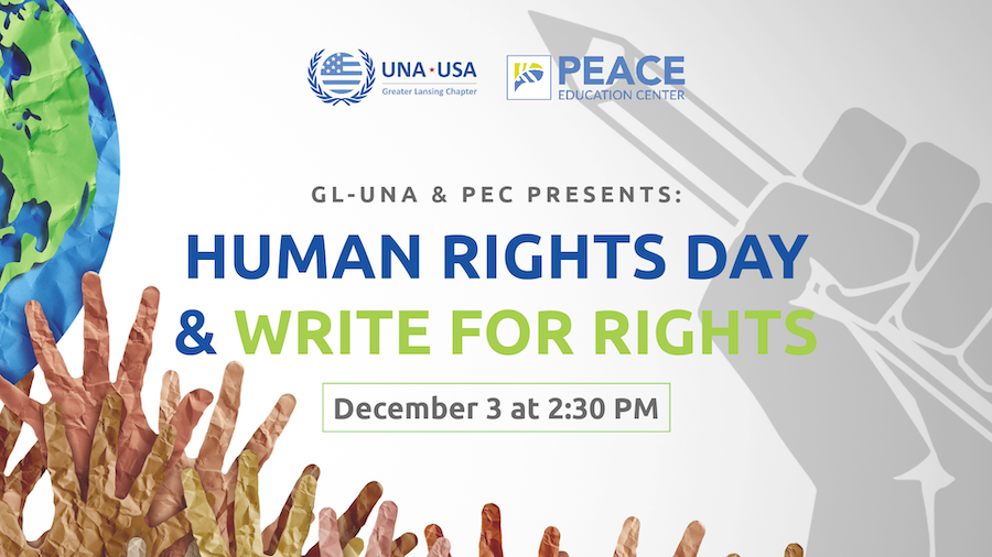 The Greater Lansing United Nations Association is teaming up with the Peace Education Center to host a “Write for Rights” writing party at 2:30 p.m. Sunday (Dec. 3) at University United Methodist Church. The event is part of their Human Rights Day program. At least three MSU Humphrey Fellows will discuss human rights as it relates to their countries - Burundi, Guyana and Pakistan. Also, the United Nations response to the crisis in the Middle East will be discussed.