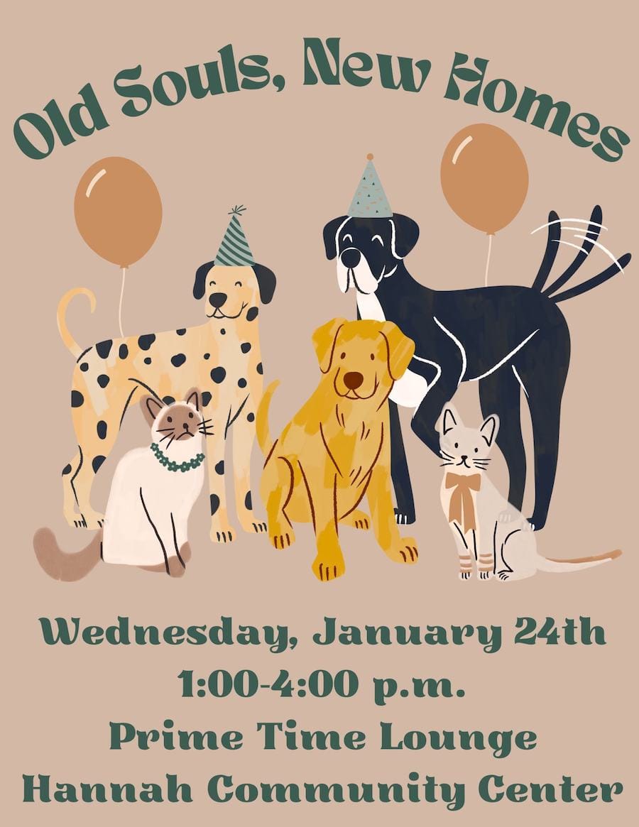 Sometimes older, calmer pets are overlooked for adoption. The Prime Time Senior Program is partnering with Saved by Zade, Happy Feet Pet Rescue, and the Constellation Cat Cafe to host an "Old Souls, New Homes" pet adoption event 1-4 p.m. Wednesday (Jan. 24). Prime Time said on its Facebook page, “Please join us for this amazing event, and maybe meet a new fur-ever friend!”