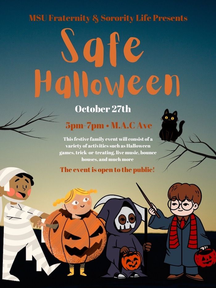 Safe Halloween will be on Thursday, Oct. 27, from 5-7 p.m., and that will happen as usual along M.A.C. Avenue north of Albert Avenue. For that event, the sororities and fraternities show the kids a great time, with games and treats and more.