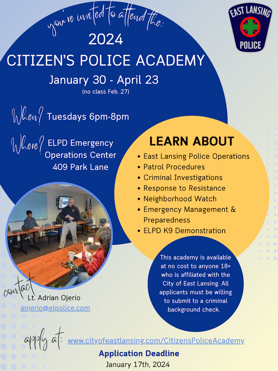 For those interested in gaining working knowledge of the East Lansing Police Department (ELPD), consider applying for the 20-week Citizens’ Police Academy. The academy meets every Tuesday Jan. 30-April 23 from 6-8 p.m. You can find more information and apply here.