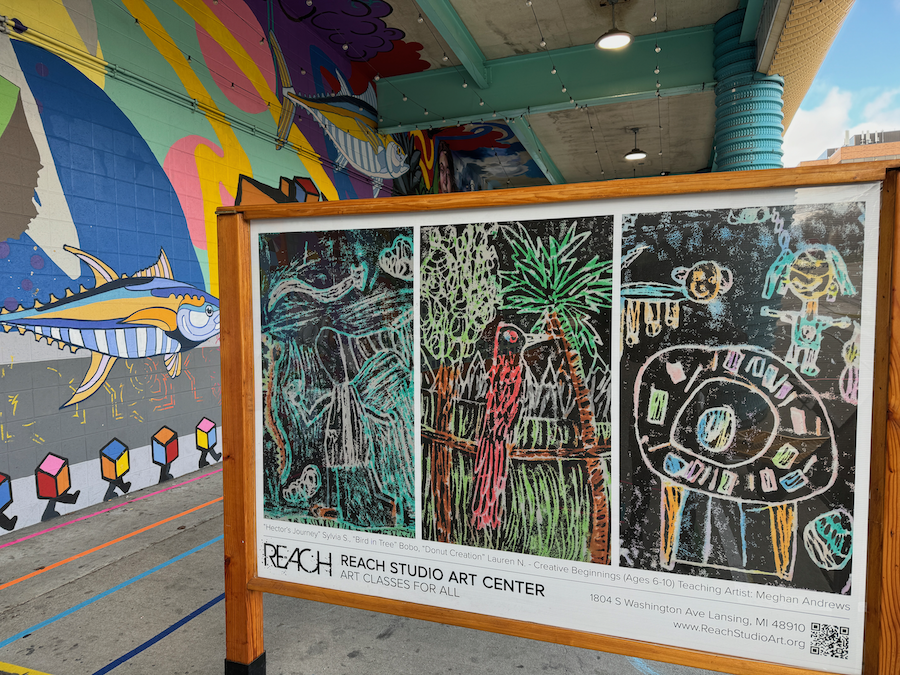 Community members are invited to visit downtown East Lansing to view the latest rotating art display, which features vibrant images in collaboration with REACH Studio Art Center. REACH is a campus of seven studios located in the REO Town district of Lansing or around town through the REACH Art Truck program. The rotating art display was established by the East Lansing Downtown Development Authority (DDA) in 2021 as an open-air public space. It includes four double-sided exhibit panels, each measuring 4-foot by 6-foot, along the 400 block of Albert Avenue on the north side of the Division Street Parking Garage.