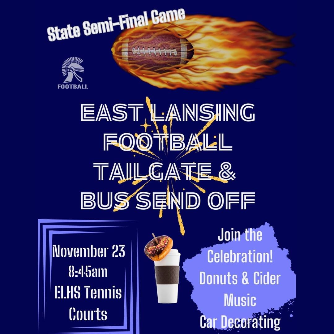 At 1 p.m. today (Saturday, Nov. 23) the East Lansing Trojans football team will take on Byron Center for the right to play in the state championship game. The game will be played at Greenville High School. Community members are invited to help send the team off by gathering at the ELHS tennis courts at 8:45 a.m. Go Trojans!