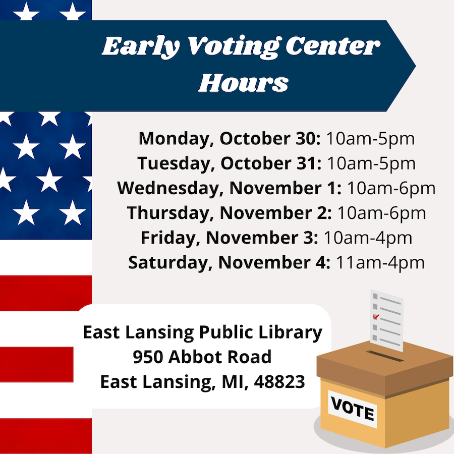 This past week, Reporter Elijah Taub reported on the East Lansing Early Voting Center that will open Monday (Oct. 30) in the East Lansing Public Library. A kickoff event will be held at 9:45 a.m. and feature speakers like Mayor Ron Bacon and Rep. Penelope Tsernoglou. The report is a top story in the ELi Now live news updates column.
